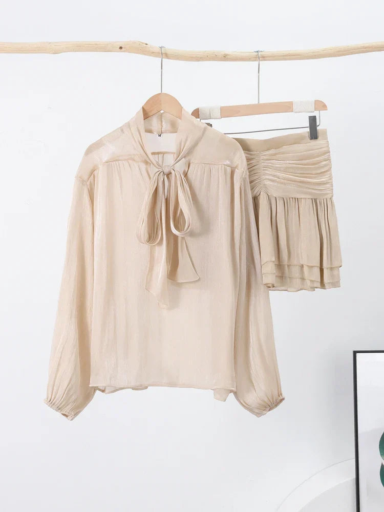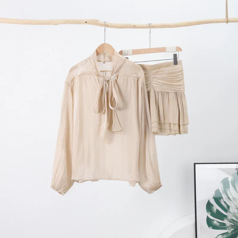Das Ada Damen Set kombiniert eine stilvolle Bluse mit einer hohen Taille und einem eleganten Plissee-Rock. Ideal für besondere Anlässe oder den Alltag, bietet dieses Outfit sowohl Komfort als auch einen modischen Look. Die lange Laternenhülle der Bluse verleiht dem Ensemble eine feminine Note, während die Schnürung für einen trendigen Akzent sorgt.