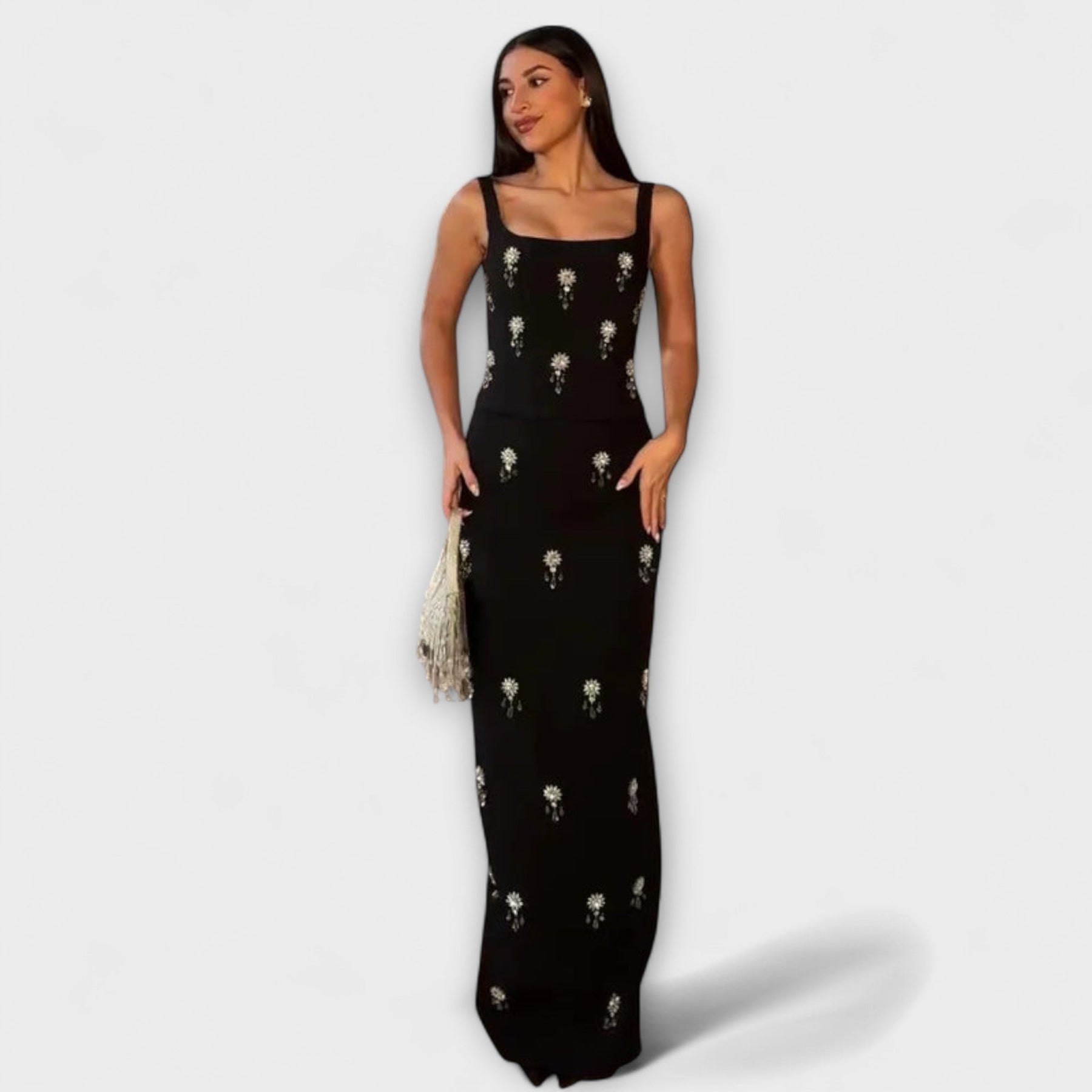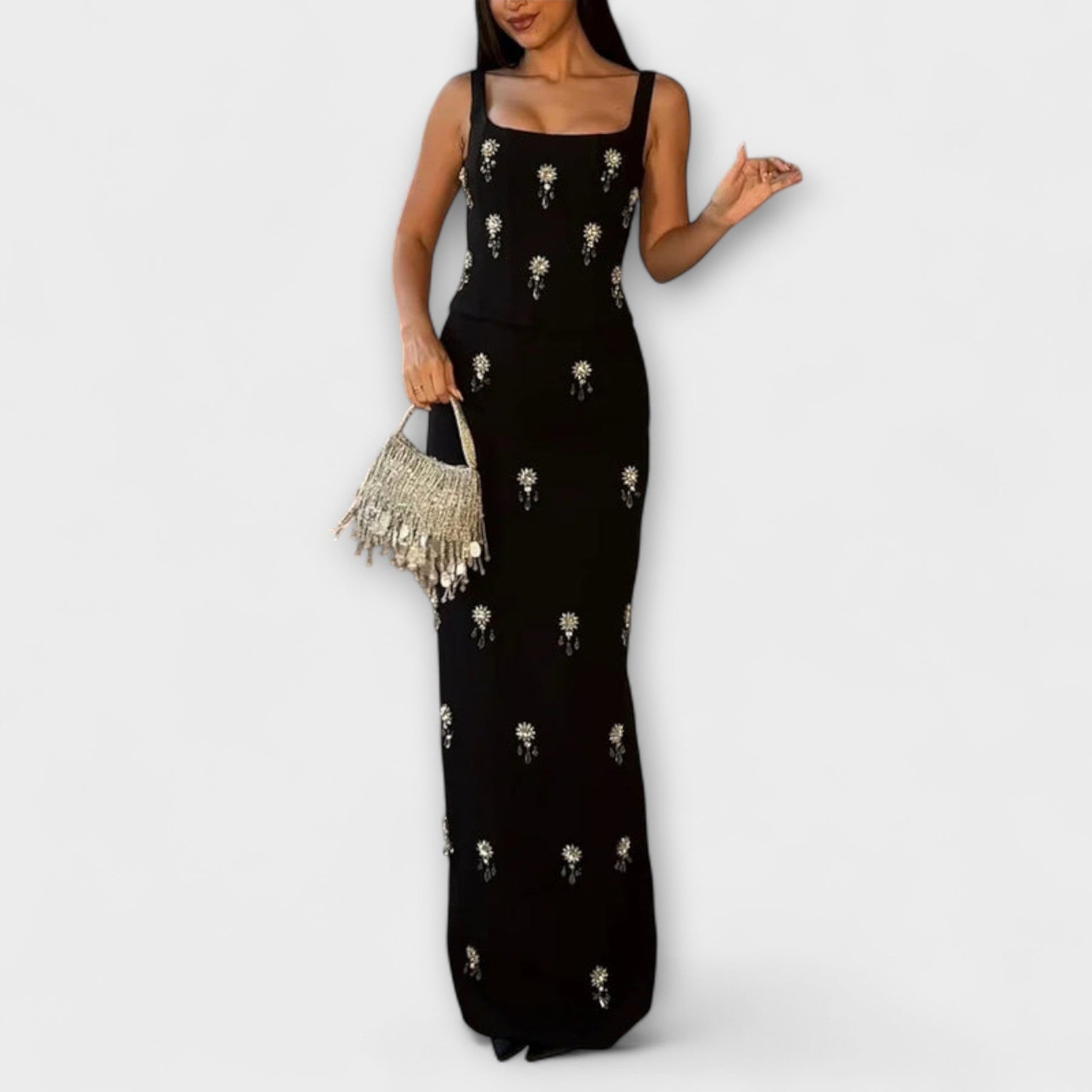 Avalon - Schwarzes Perlenzipper Oberteil und Rockensemble