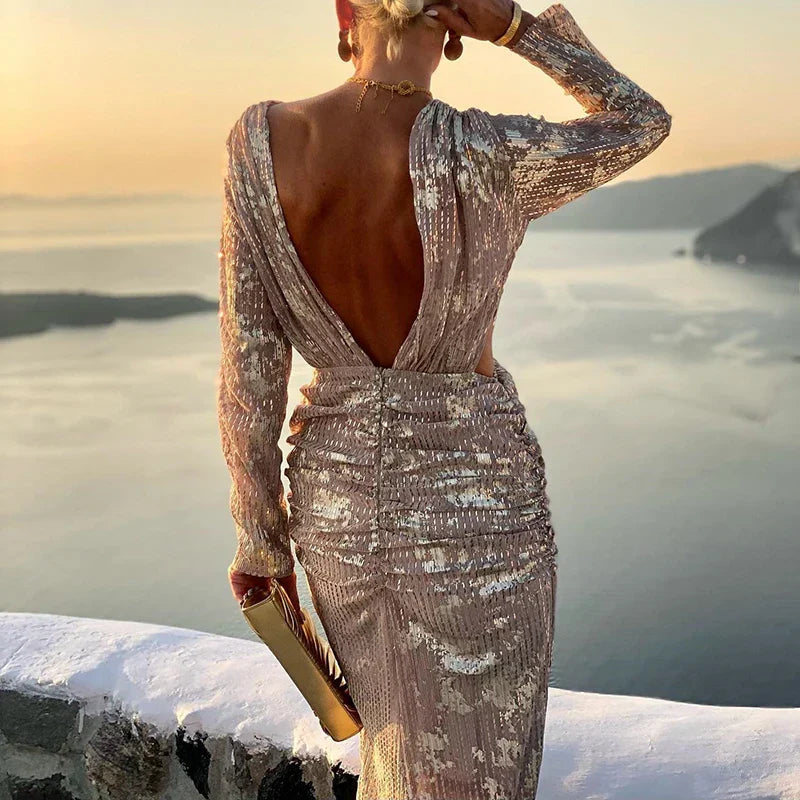 Setzen Sie ein Zeichen der Eleganz in diesem hoch taillierten Abendkleid, das mit funkelnden Pailletten verziert ist und einen tiefen V-Ausschnitt sowie ein rückenfreies Design aufweist. Ideal für Feste oder besondere Anlässe.