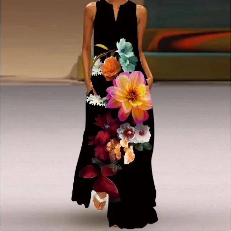 Avelena | V-Ausschnitt Smaragdblumen Ärmelloses Kleid