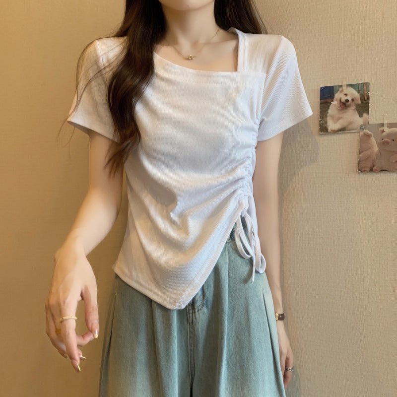Damen Raffung seitliche Bindung T-Shirt mit quadratischem Ausschnitt Heidi-Mode