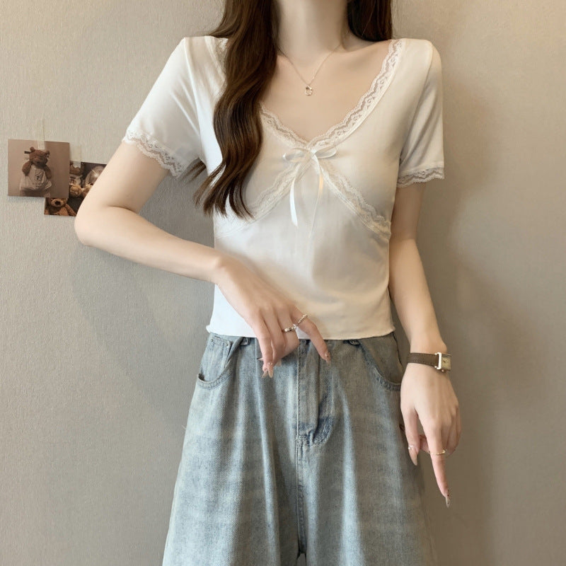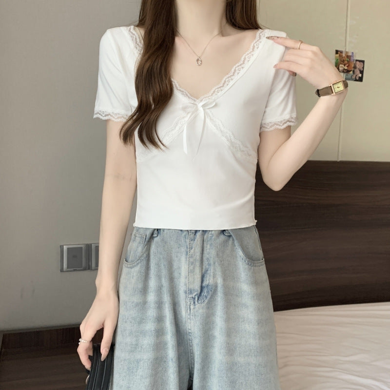 Entdecken Sie unser beeindruckendes V-Ausschnitt-Top mit Spitzenbesatz und einem niedlichen Schleifendetail, designed für die moderne Frau, die Wert auf Stil und Bequemlichkeit legt. Dieses elegante Top vereint feine Spitzenakzente mit einem schmeichelhaften V-Ausschnitt und kreiert so einen geschmackvollen und zugleich anziehenden Look, der zu verschiedenen Gelegenheiten passt.