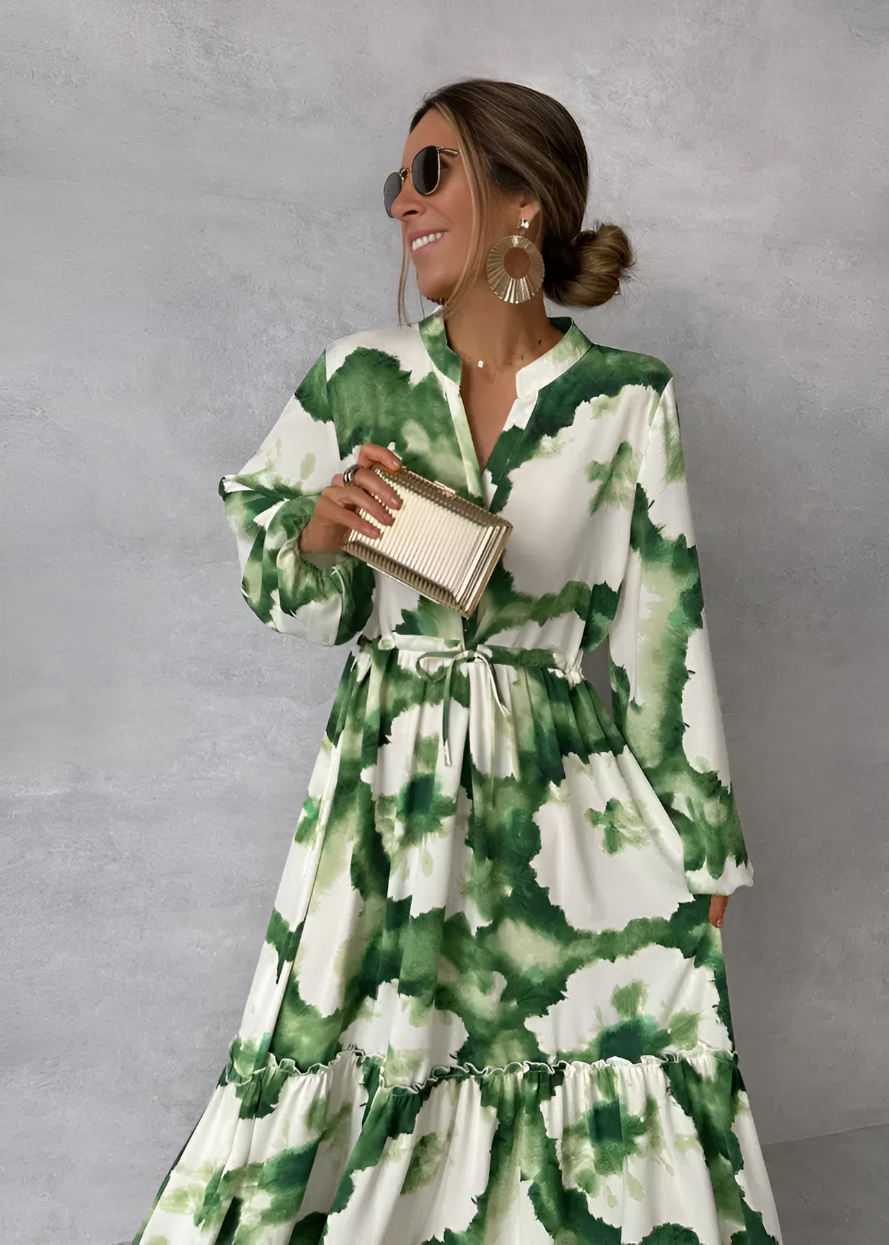 Elina | Grünes Maxikleid – Langarm & V-Ausschnitt
