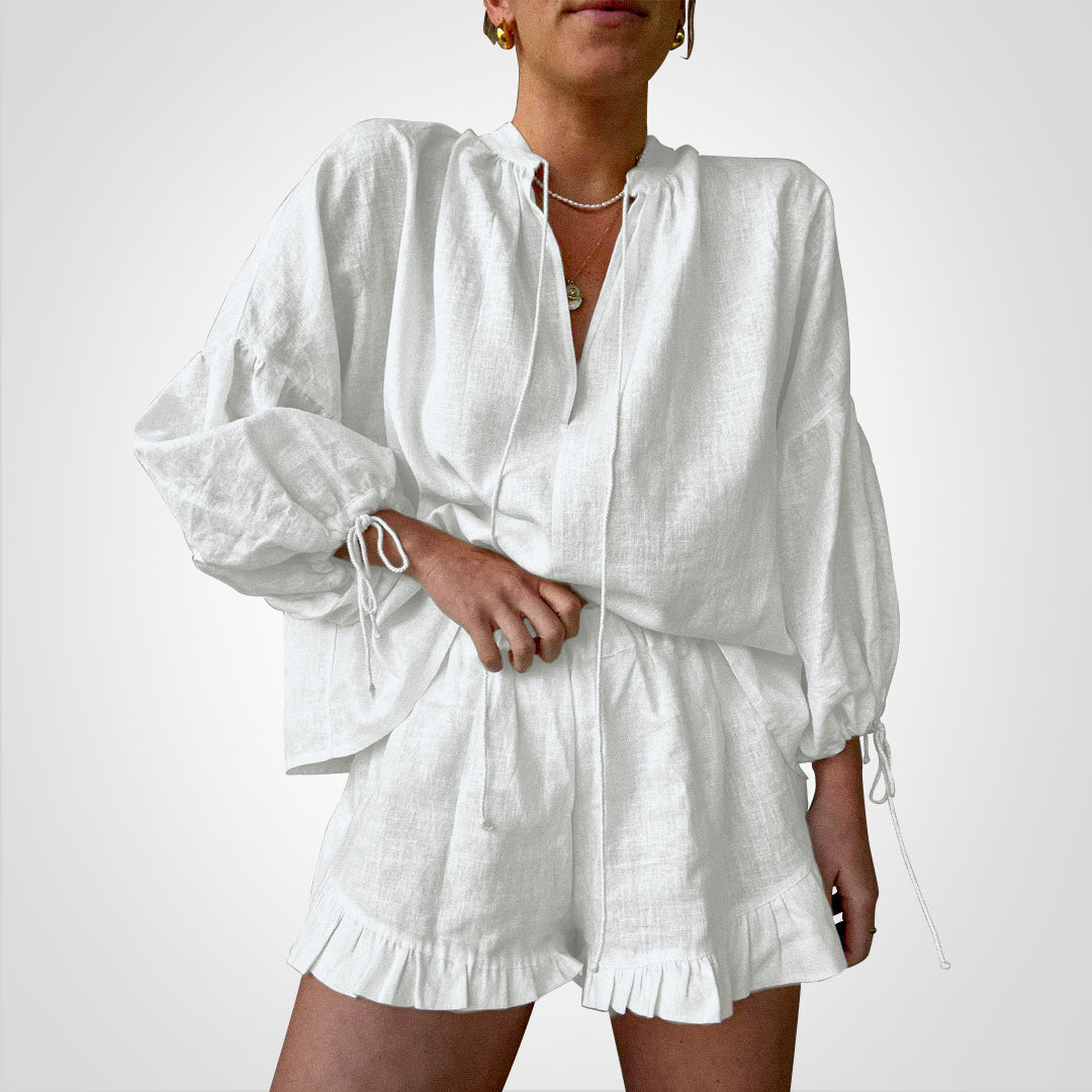 Die luftige Bluse mit feinen Spitzendetails passt perfekt zu den lockeren Shorts – stilvoll und bequem zugleich.