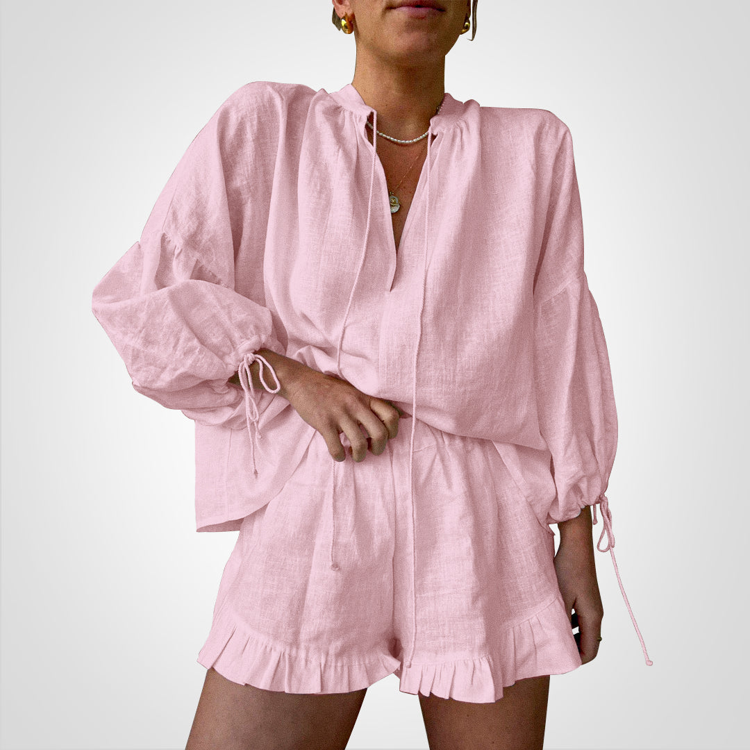 Stell dir vor: warme Sonnenstrahlen auf deiner Haut, eine sanfte Brise im Haar und du in einem Sommer-Set, das so angenehm zu tragen ist, wie es aussieht. Elvira bringt mühelose Eleganz in deine Sommergarderobe – egal ob beim Stadtbummel am Meer oder bei einem entspannten Abendessen im Freien.