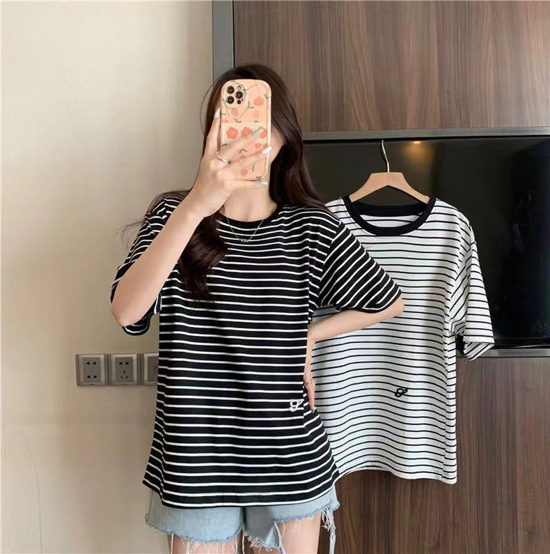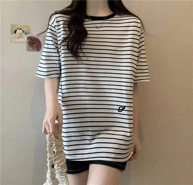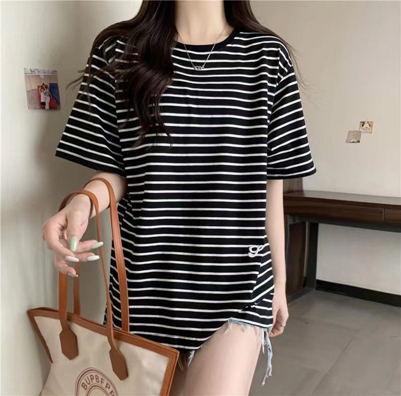 Erneuern Sie Ihre Garderobe mit diesem mühelos eleganten Femme Relaxed Fit gestreiften T-Shirt und setzen Sie überall, wo Sie sind, ein selbstbewusstes Zeichen!
