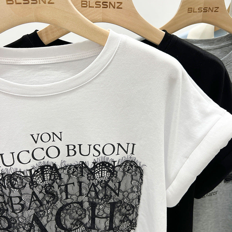 Elegantes Femme Graphic Spitzen-Detail T-Shirt