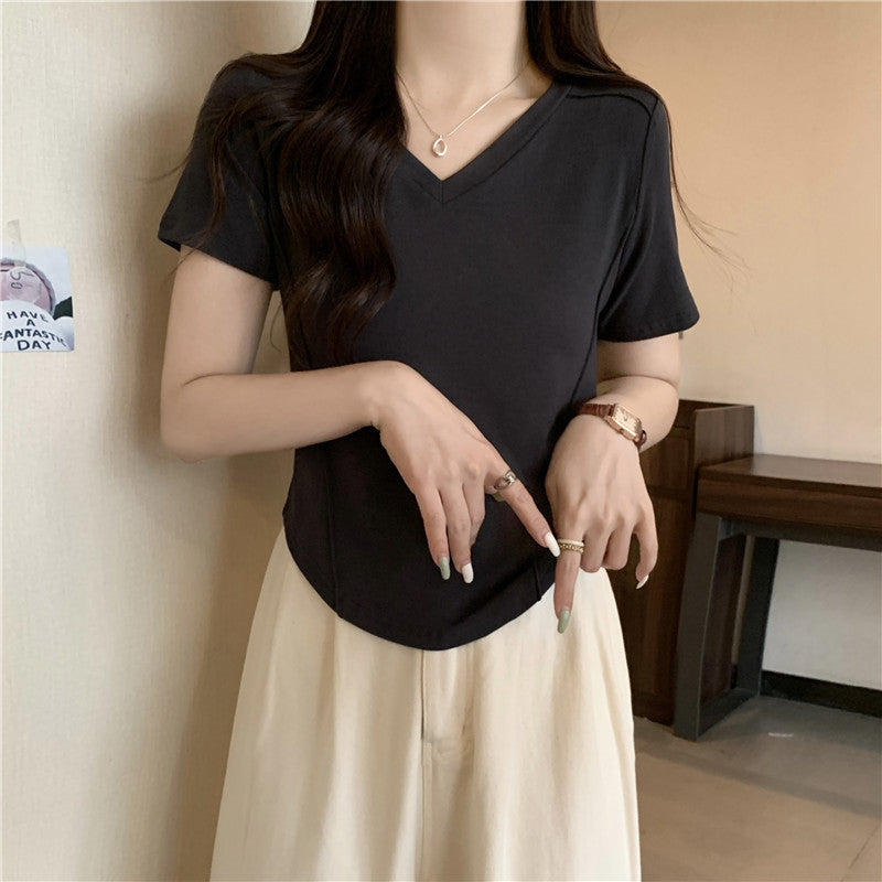 Femme Kurzarm V-Ausschnitt Basic T-Shirt Heidi-Mode