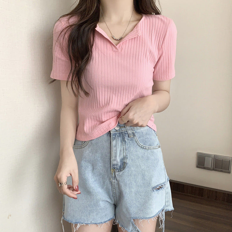 Femme Ripp Kurzarm Knopf-Oberteil Heidi-Mode
