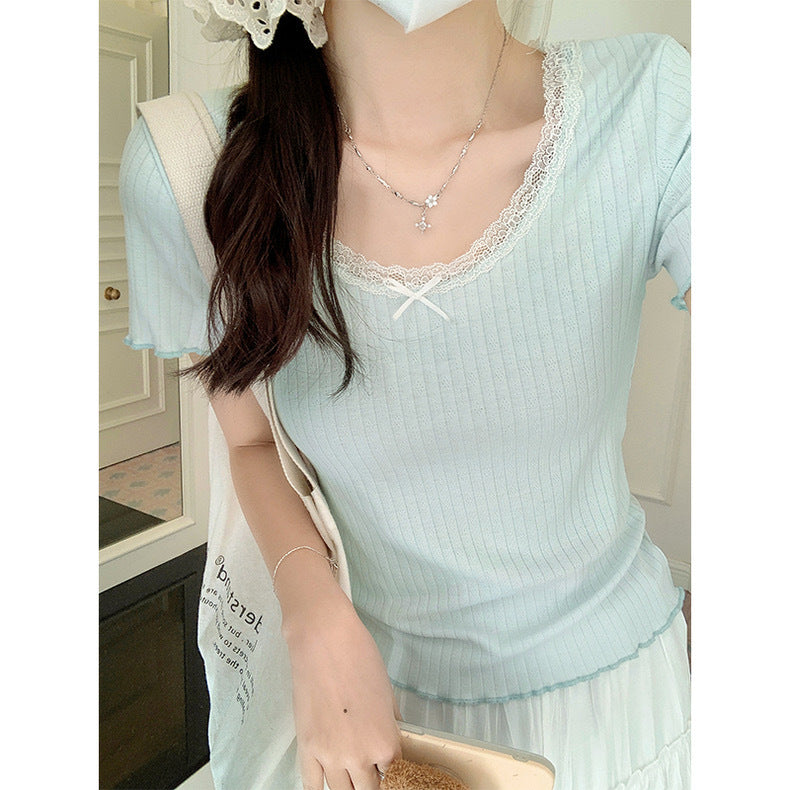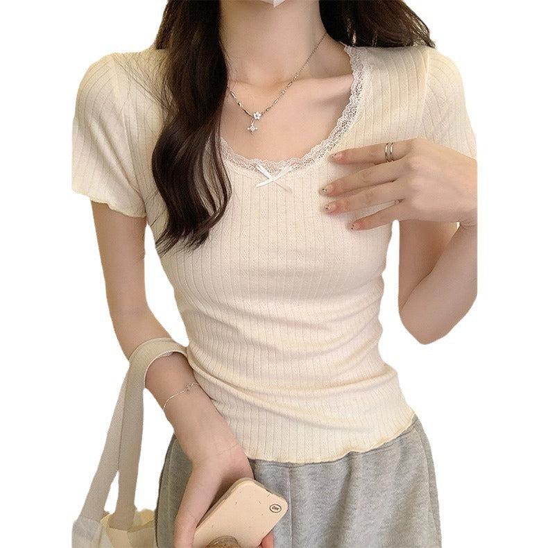 Dieses Top ist nicht nur ein Kleidungsstück; es ist eine wesentliche Bereicherung Ihrer Garderobe, die Stil und Bequemlichkeit mühelos vereint. Egal, ob Sie sich für ein schickes Brunch-Outfit entscheiden oder lässig unterwegs sind, das Femme Rippen-Lace Trim Kurzarm-Top ist Ihre bevorzugte Wahl.