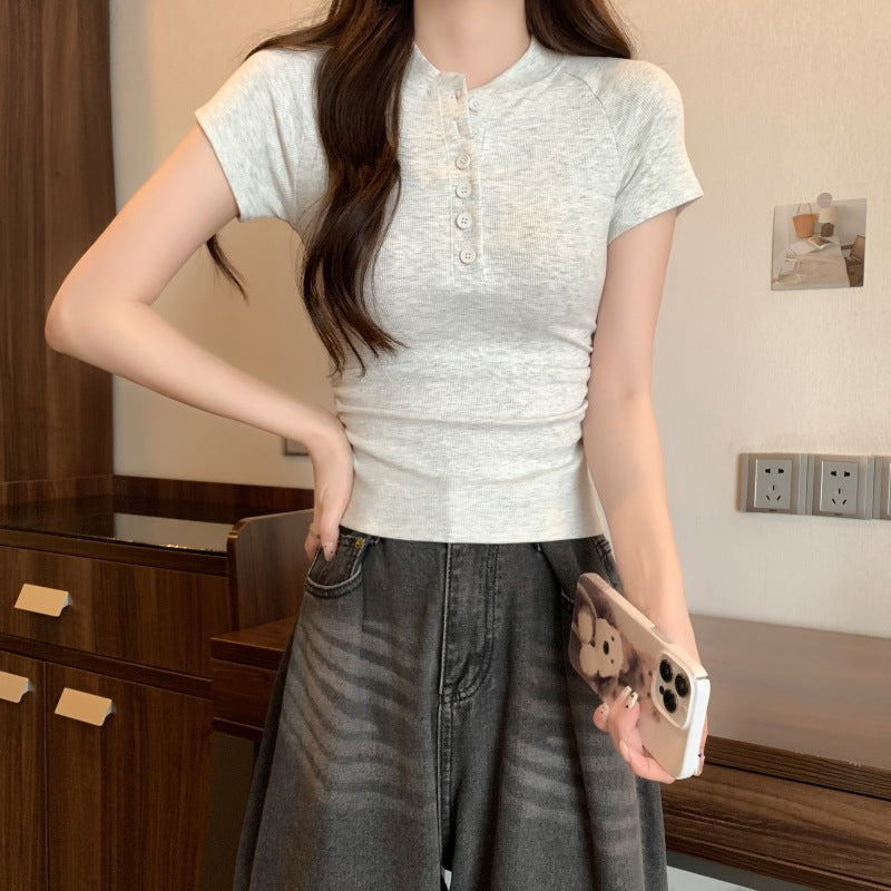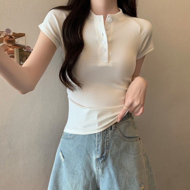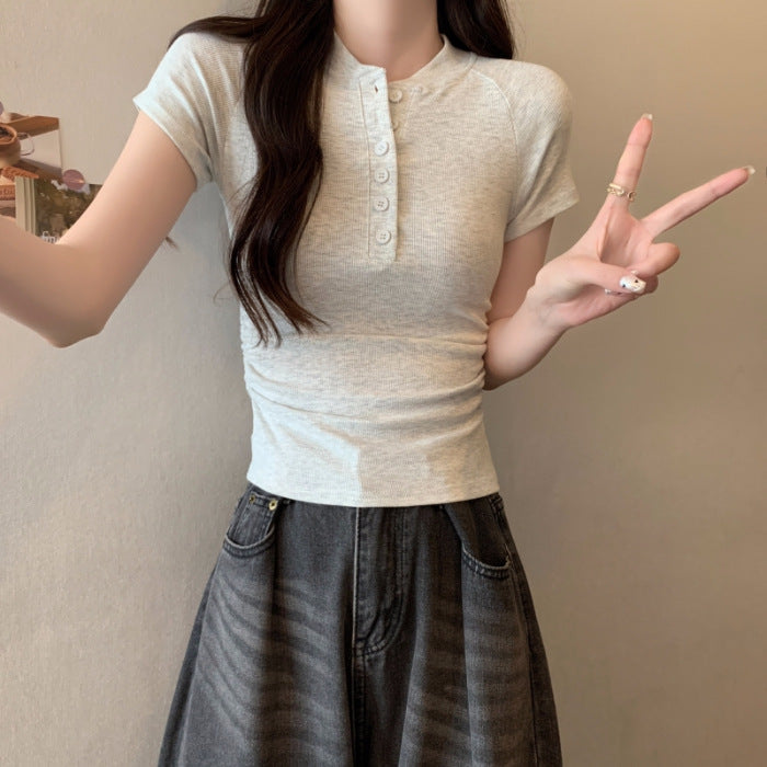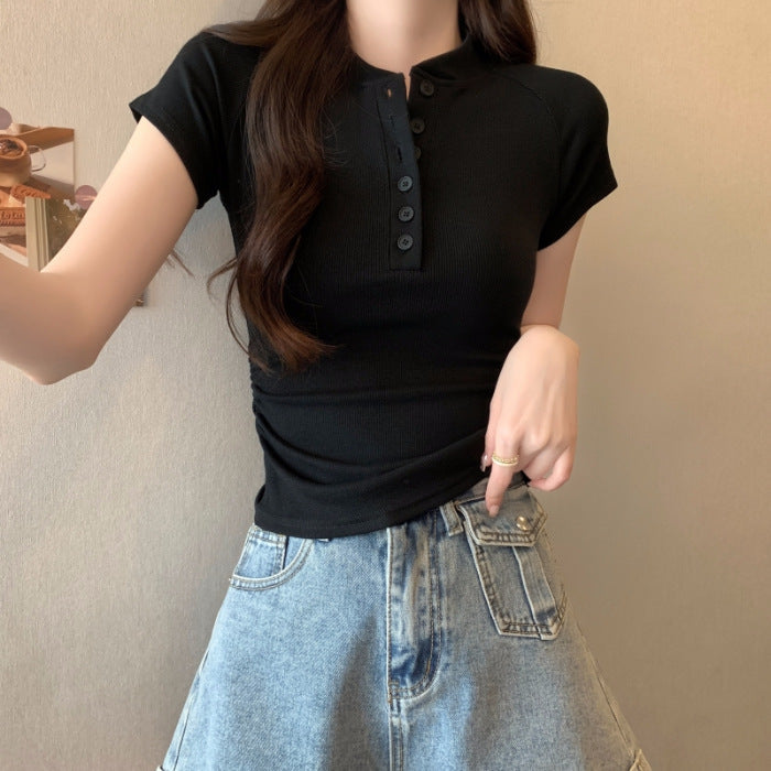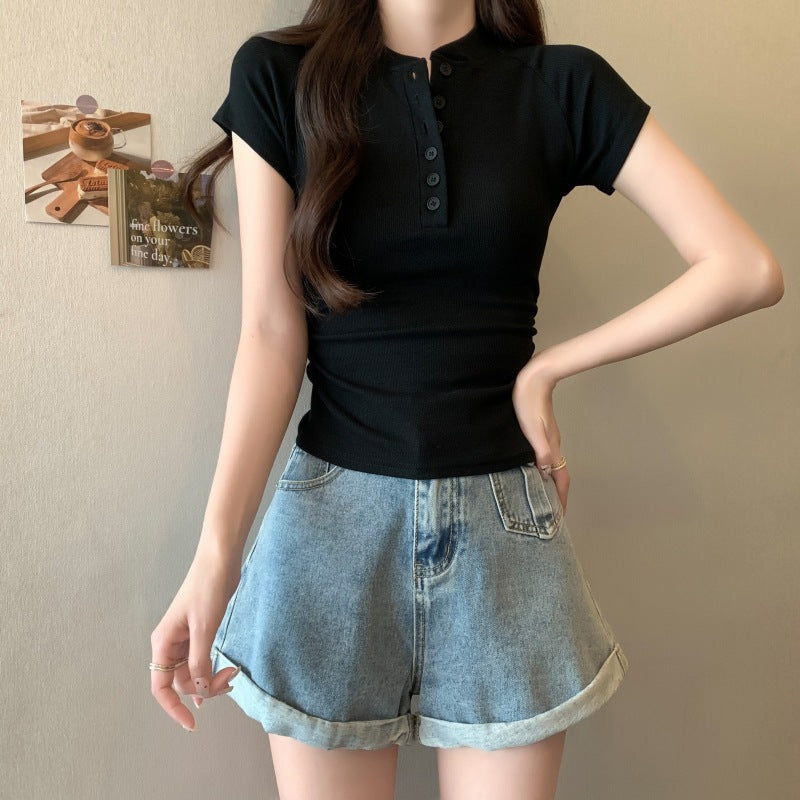 Erleben Sie Komfort und Stil mit unserem gerippten Kurzarm-Button-Up-Top, das speziell für die moderne Frau gestaltet wurde. Dieses vielseitige Oberteil bietet einen einzigartigen Button-Up-Ausschnitt für einen mühelosen und dennoch eleganten Look, ideal zum Kombinieren mit hoch taillierten Jeans oder Röcken.
