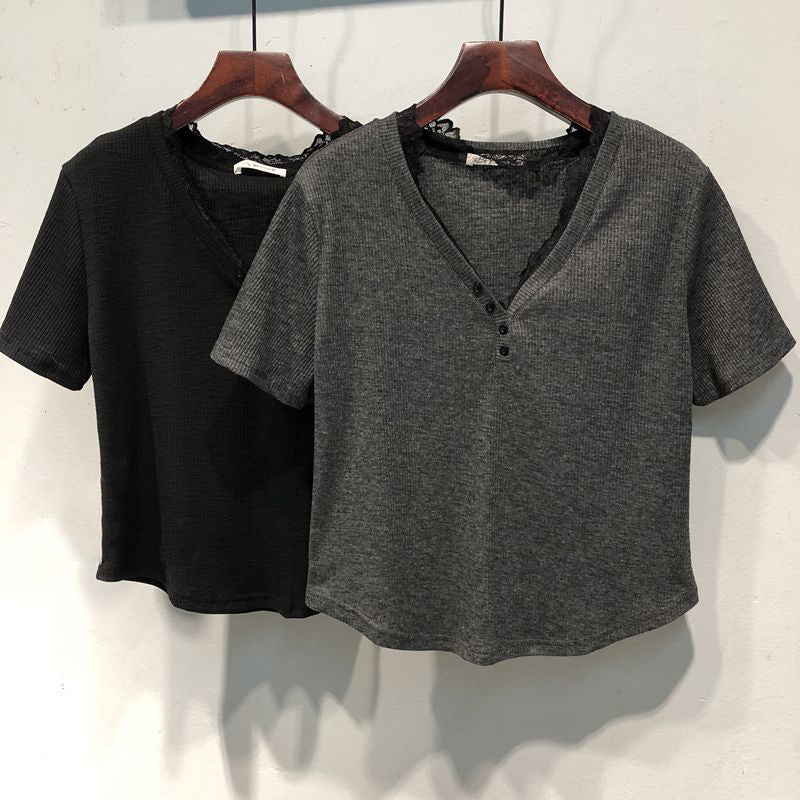 Präsentation unseres attraktiven V-Ausschnitt Baumwoll-T-Shirts mit Spitzenbesatz