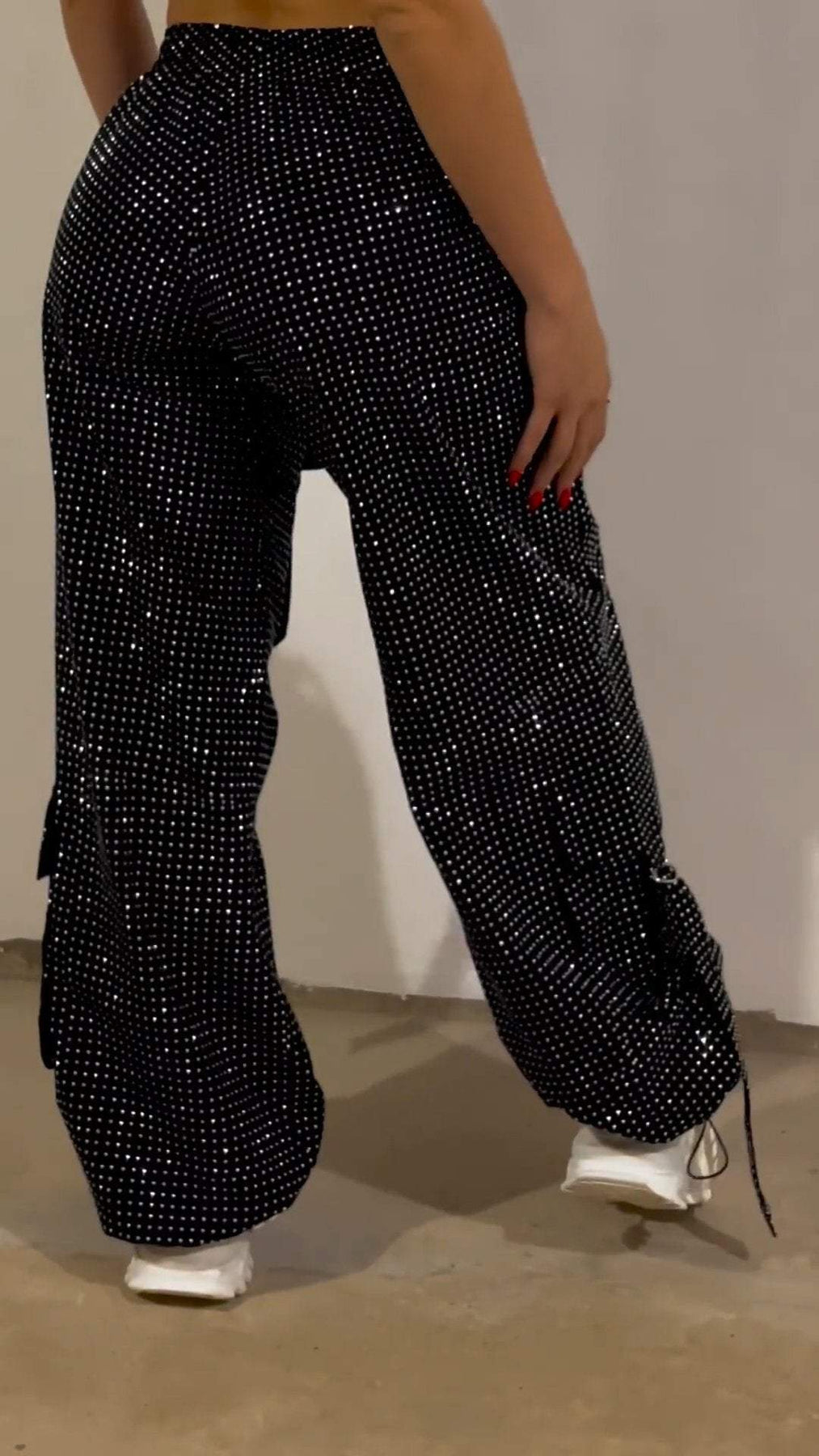 Diese funkelnde Cargo-Hose mit Strassdetails kombiniert Funktionalität mit einem trendigen und auffälligen Design. Perfekt für Streetwear-Looks oder glamouröse Events, bei denen Sie auffallen möchten.
