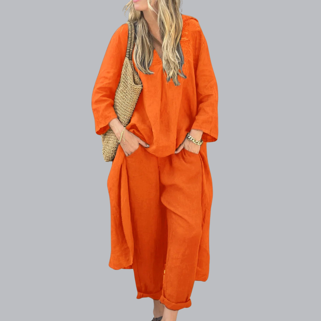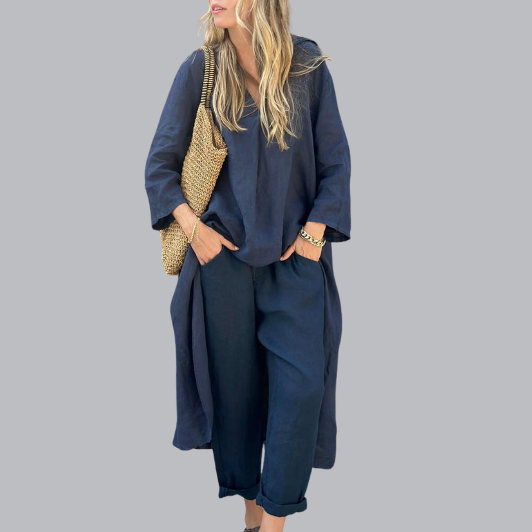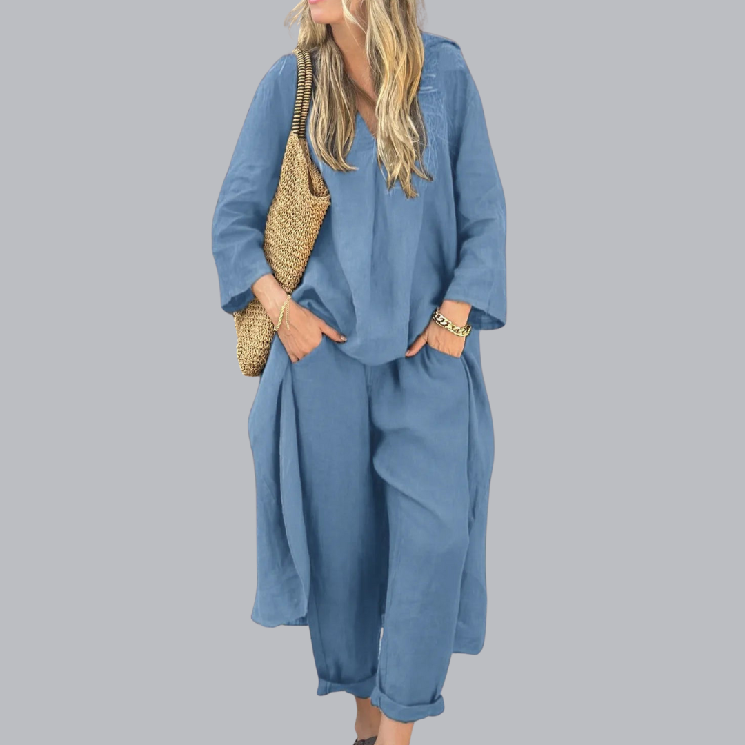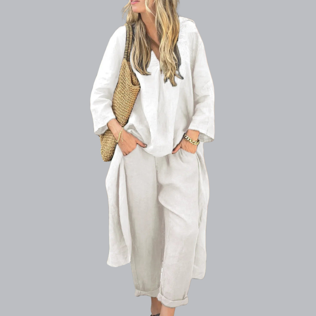 Begrüßen Sie die sonnigen Tage mit unserem beliebten, stilvollen Zweiteiler, der Eleganz und Komfort perfekt vereint. Egal, ob Sie zu einem Brunch oder einem Abendessen gehen, dieses Outfit sorgt dafür, dass Sie sich den ganzen Tag über frisch und selbstbewusst fühlen. Lassen Sie sich von der Leichtigkeit und dem modernen Design begeistern!