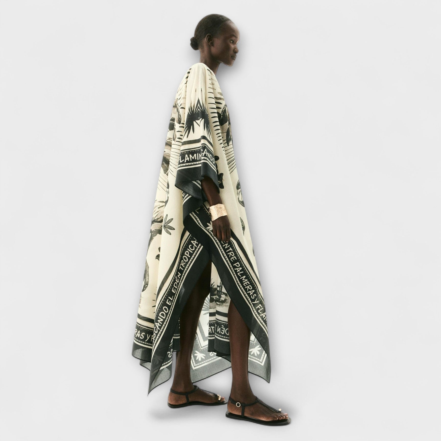 Verleihen Sie Ihrem Urlaubsstil einen Hauch von Eleganz mit unserem oversized Flamingo-Kaftan-Kleid, das für mühelose Eleganz und Komfort entworfen wurde. Dieses atemberaubende Stück verfügt über einen verspielten Flamingo- und Palmenprint auf einer schicken, hellbeigen und schwarzen Basis.