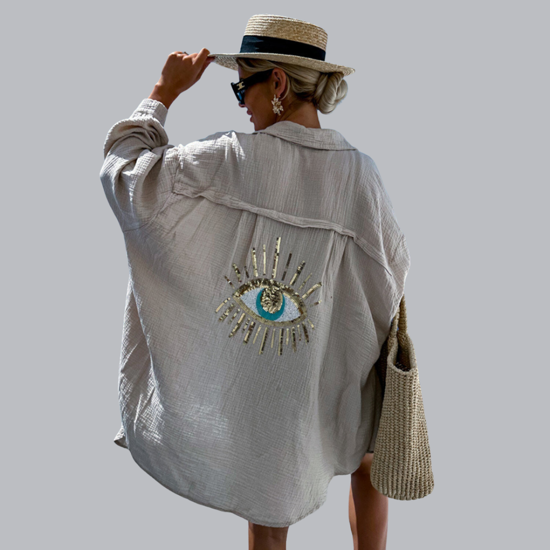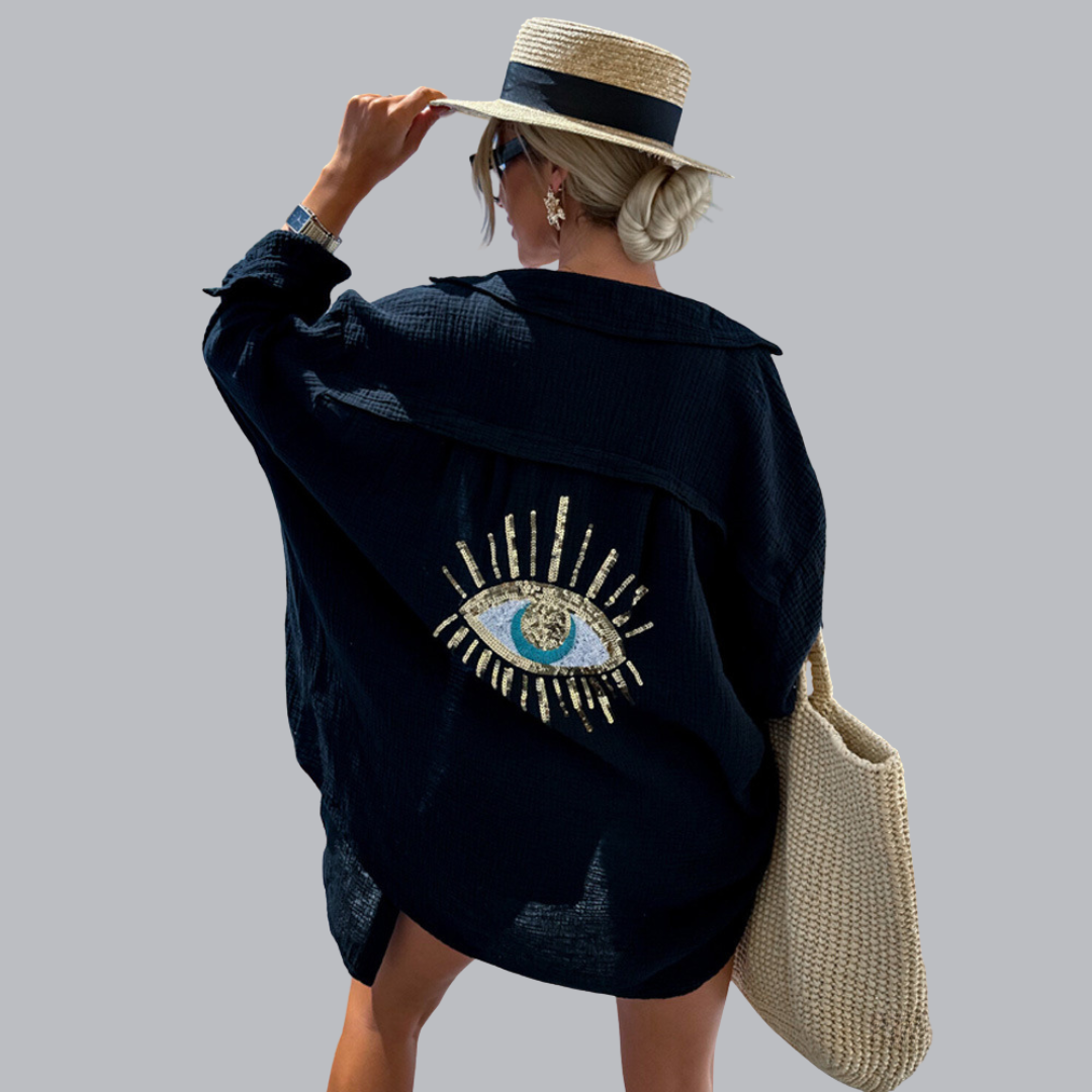 Einzigartiges Rückendetail – Ein atemberaubendes, gesticktes Auge mit Pailletten und Perlen lässt Ihr Outfit von hinten sprechen.