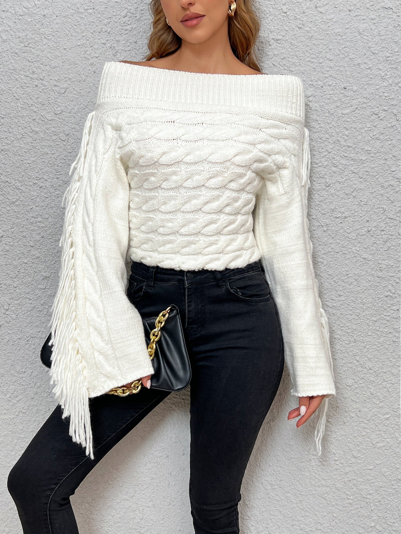 Schulterfreier Zopfmuster-Pullover | Fransen-Details | Boho-Eleganz