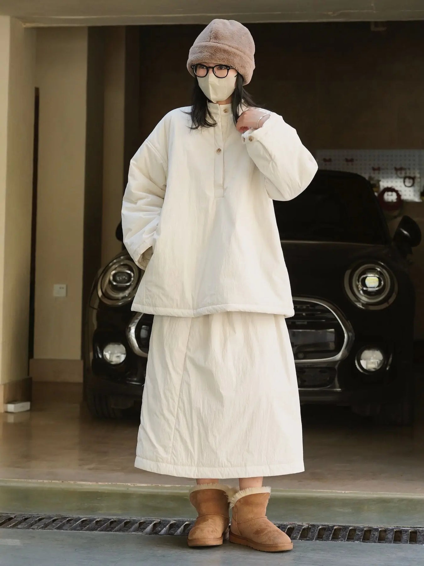 Mit ihrer legeren, lockeren Passform und den warmen, weichen Materialien hält die Jacke kuschelig warm, während der hohe Stehkragen zusätzlichen Schutz vor Kälte bietet. Die Knöpfe auf der Vorderseite verleihen der Jacke einen klassischen, stilvollen Look, der sich vielseitig kombinieren lässt.