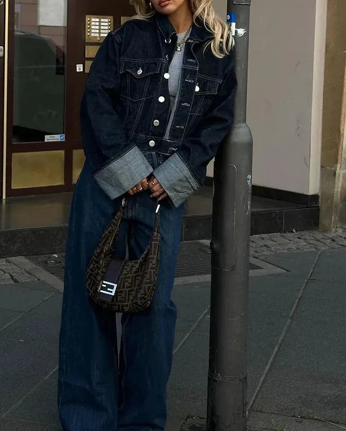 Ein modernes Denim-Set für stilbewusste Frauen! Dieses zweiteilige Set kombiniert eine kurze, figurbetonte Jeansjacke mit einer trendigen High-Waist-Jeans mit weitem Bein. Perfekt für einen lässigen, aber dennoch eleganten Look – egal ob für den Alltag oder besondere Anlässe. Die hochwertige Verarbeitung und der Vintage-Charakter machen dieses Set zu einem Must-have für jede Fashionista.
