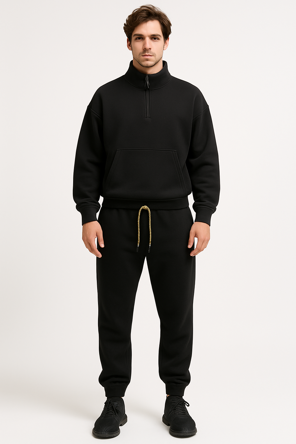 Dieses stilvolle Entspannungssatz für Herren kombiniert Komfort und Funktionalität. Hergestellt aus doppelknitischem Fleece, bietet es eine angenehme Wärme und eine saubere Silhouette. Der Halbzip-Pullover mit kräftigem Ring-Reißverschluss und praktischer vorderer Tasche sorgt für einen lässigen Look, während die Jogger mit strukturierten geflochtenen Drawcords an Taille und Manschetten ein scharfes Finish verleihen.