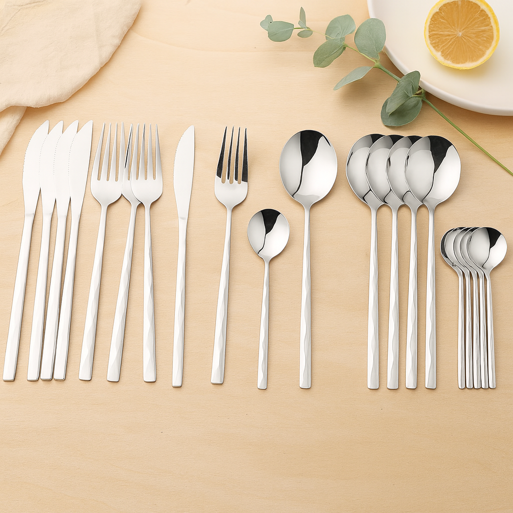• Komplette 24-teilige Kollektion – Beinhaltet Tafelmesser, Gabeln, Löffel und Teelöffel.