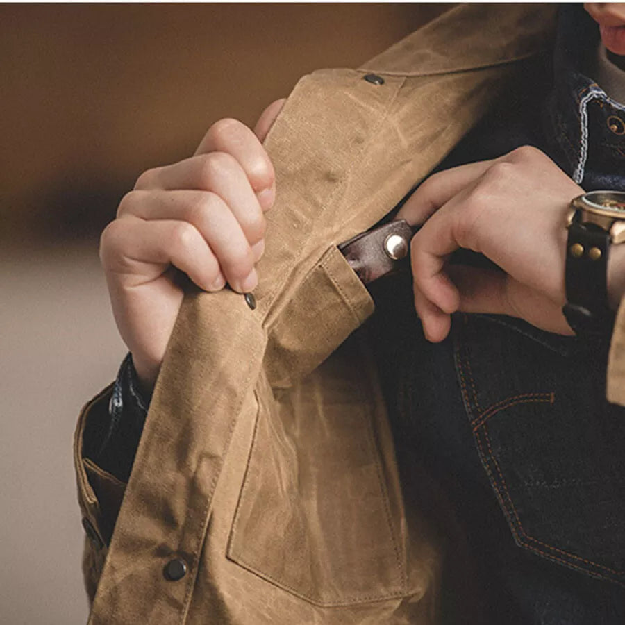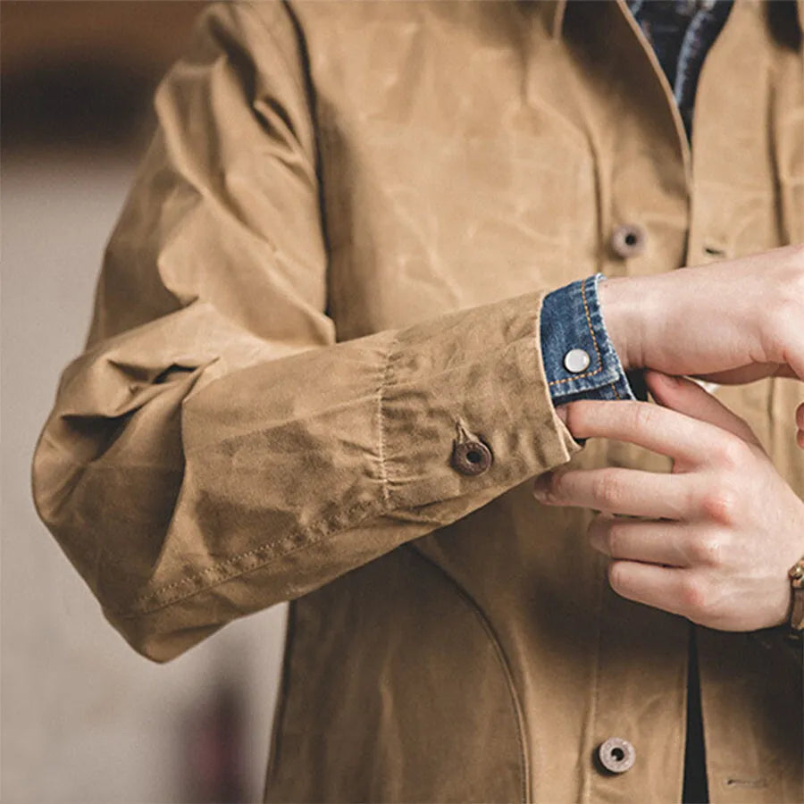 Die Oil Wax Canvas Jacket ist ein robustes und stilvolles Oberbekleidungsstück, das den Elementen trotzt und gleichzeitig einen einzigartigen, vom Vintage-Look inspirierten Look bietet. Die Jacke ist aus strapazierfähigem, wasserabweisendem, gewachstem Canvas gefertigt und bietet hervorragenden Schutz vor Regen, Wind und Abnutzung. Mit der Zeit entwickelt die gewachste Oberfläche eine deutliche Patina, die der Jacke Charakter und Tiefe verleiht und jedes Stück zu einem echten Unikat macht.