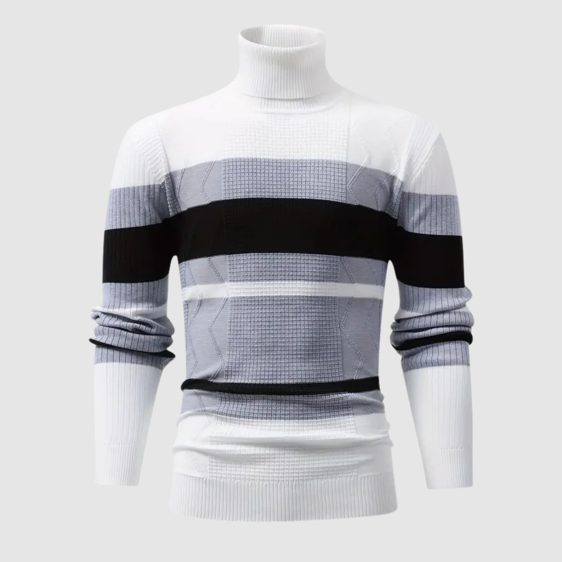Verleihen Sie Ihrer Wintergarderobe einen Hauch von Eleganz mit unserem zeitlosen und eleganten gestreiften Winterpullover mit Rollkragen. Aus einem luxuriösen Wollmischgewebe gefertigt, bietet dieser Pullover die perfekte Kombination aus Wärme, Komfort und Stil. Das schicke Streifendesign verleiht der klassischen Rollkragensilhouette eine moderne Note, während das weiche, atmungsaktive Material in den kälteren Monaten für ein angenehmes Tragegefühl sorgt. Der hohe Rollkragen sorgt für zusätzliche Wärme und macht es zu einem idealen Kleidungsstück für kühlere Tage oder als alleinstehendes Statement-Stück.