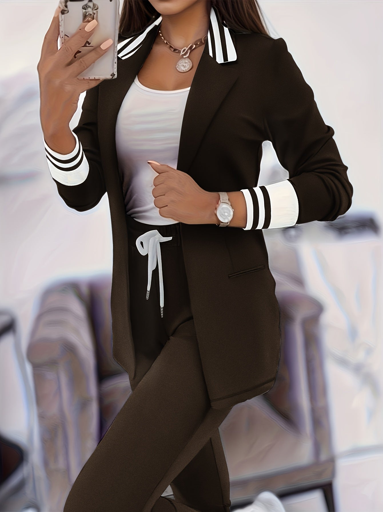 ✅Sportlich-schickes Entwurf: Kombiniert die Schärfe eines taillierten Blazers mit der Lässigkeit einer Jogginghose. Der gestreifte Kragen und die Ärmelbündchen sorgen für einen modernen, sportlichen Twist, der mühelos auffällt. Perfekt, wenn Sie gepflegt schauen und sich gleichzeitig wohlfühlen möchten. Ein Stil, der sowohl im Sitzungssaal als auch beim Brunch gut ankommt.