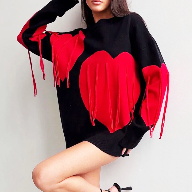 Dieser auffällige Oversize-Pullover kombiniert Komfort mit einem einzigartigen Design. Die roten Herz-Applikationen mit Fransen sorgen für eine extravagante Optik, während der weite Schnitt maximale Gemütlichkeit bietet. Perfekt für mutige Fashion-Liebhaberinnen!