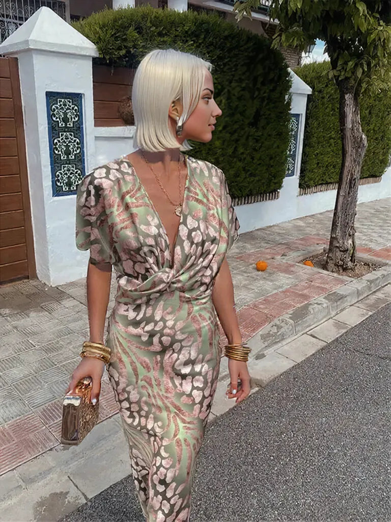 Raffinierter V-Ausschnitt: Der verdrehte Schnitt betont das Dekolleté und verleiht dem Look moderne Eleganz.